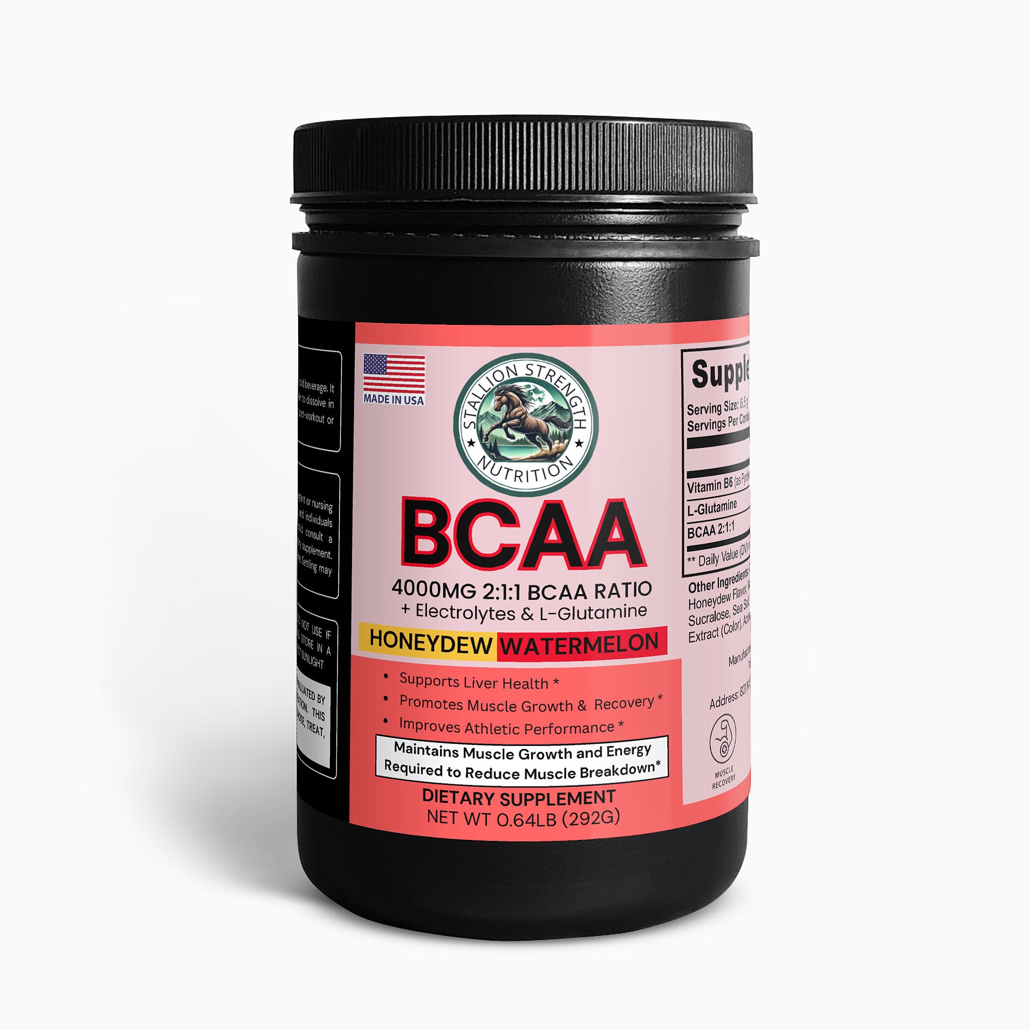 Ingredients: Vitamin B6 (as Pyridoxine Hydrochloride), L-Glutamine, BCAA 2:1:1, Citric Acid, Honeydew Flavor, Watermelon Flavor, Potassium Citrate, Silicon Dioxide, Sucralose, Sea Salt, Beet Powder (Color), Grape Skin Extract (Color), Acesulfame Potassium.