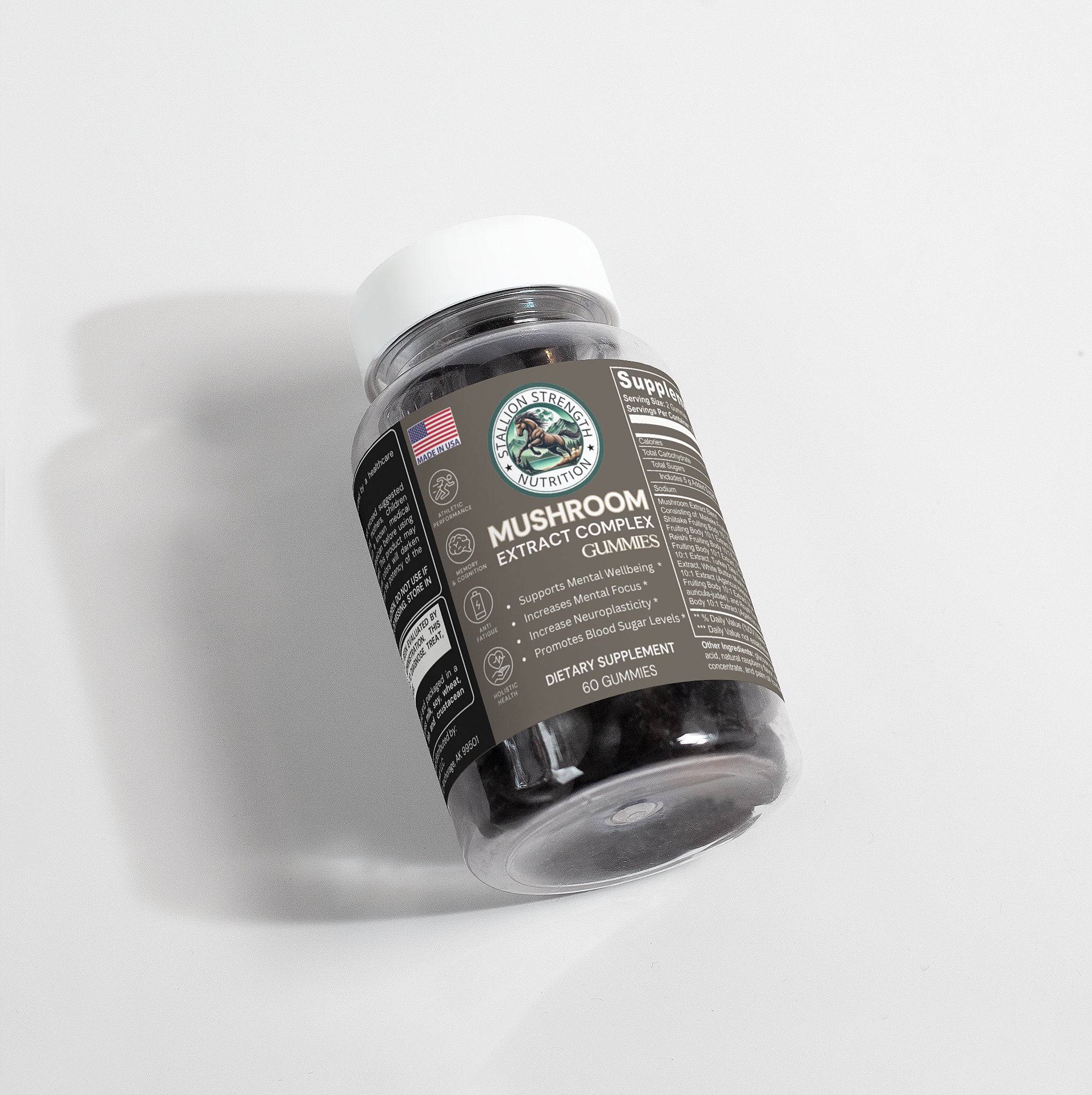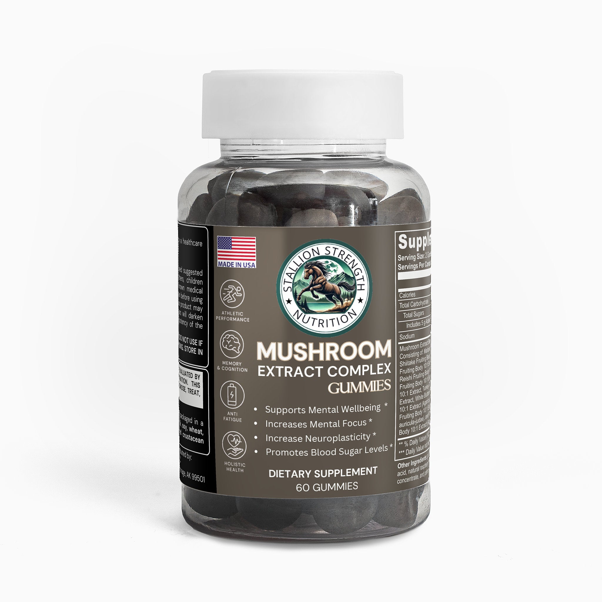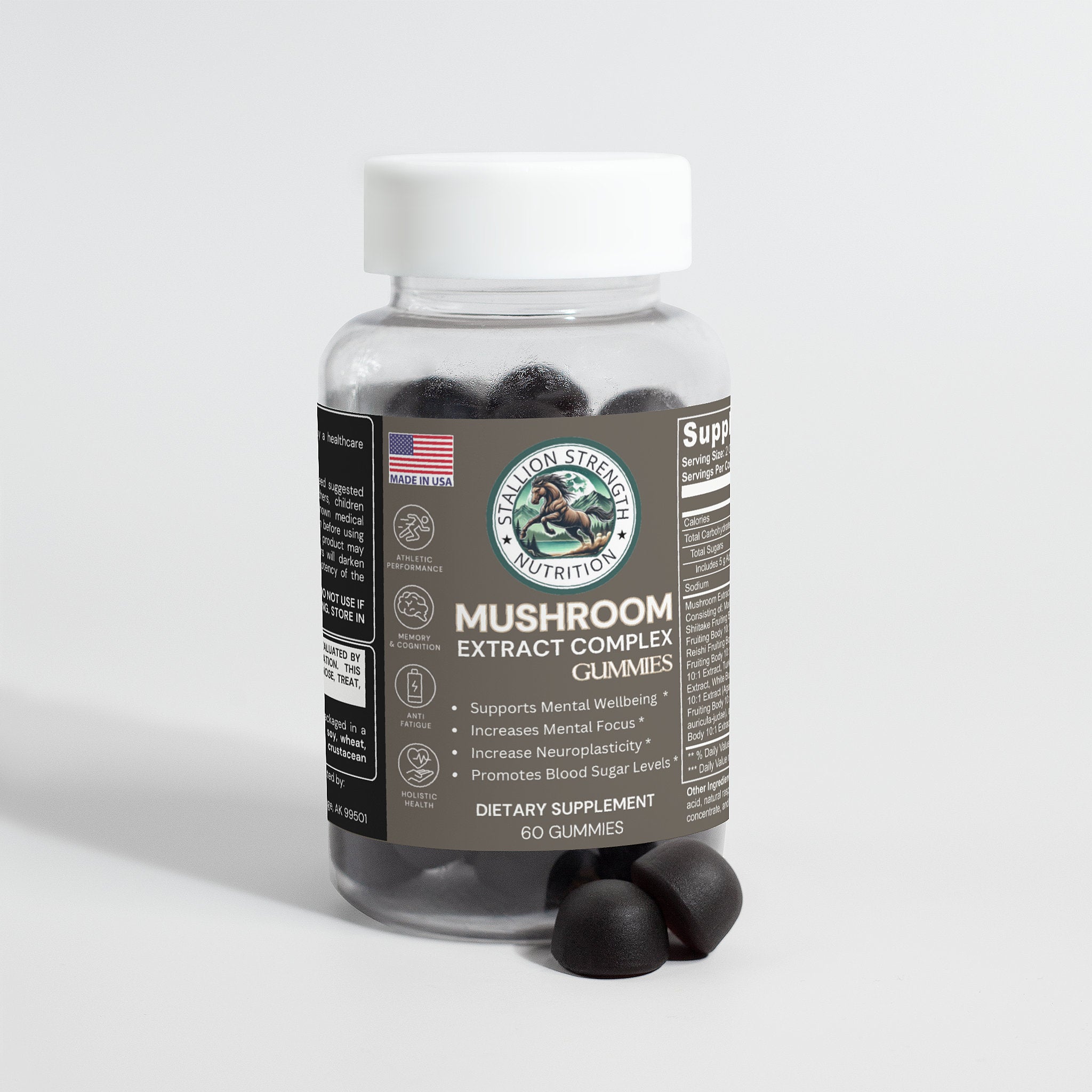 Ingredients: Mushroom extract (Maitake Fruiting Body 10:1 Extract, Shiitake Fruiting Body 10: 1 Extract, Lion’s Mane Fruiting Body 10:1 Extract, Reishi Fruiting Body 10:1 Extract, Cordyceps Fruiting Body 10:1 Extract, Chaga Fruiting Body 10:1 Extract, Turkey Tails Fruiting Body 10:1 Extract, White Button Mushroom Fruiting Body 10:1 Extract, Black Fungus Fruiting Body 10:1 Extract, Royal Sun Mushroom Fruiting Body 10:1 Extract), glucose syrup, sugar, dextrose, pectin, citric acid, natural raspberry flavor, sodium citrate, purple carrot juice concentrate, palm oil (contains carnauba wax).